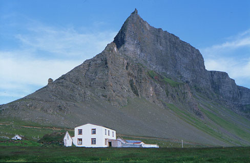 I like this strange compination of concrete and the old way of making walls out of turf and stone simply because the concrete part seems so desperate in trying to fit in.