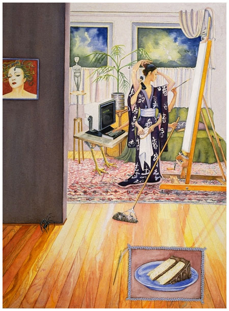 full sized image 242K Piece of Cake watercolor, needle and thread 14 x 19 inches original painting and reproductions available |
