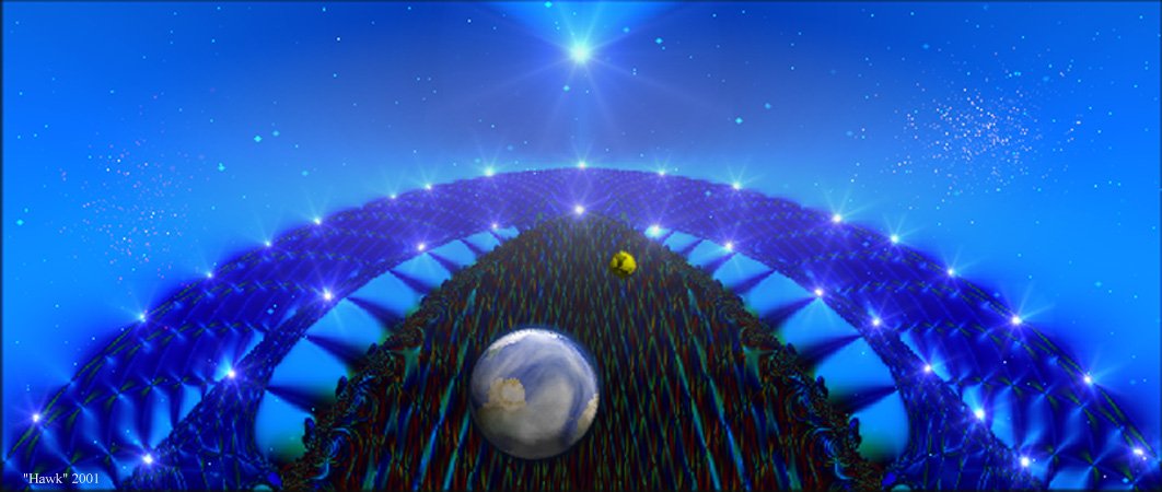 When you cross this bridge that spans deep blue space, you will pass through the Mists of Time and Hawk will be there to greet you and take you on a tour of his Domain. He will gently take you in his wings and show you all the color and beauty that surrounds you. The impossible will become the possible and you will be transported to a place where hearts and souls do dwell, a place that once was and will be forevermore...