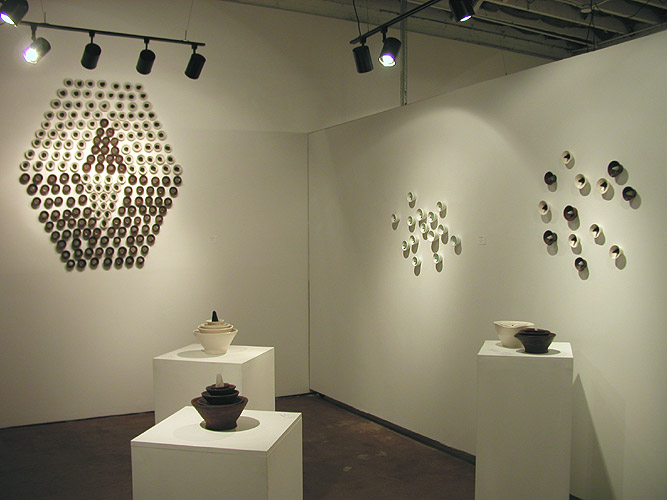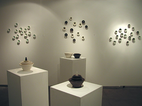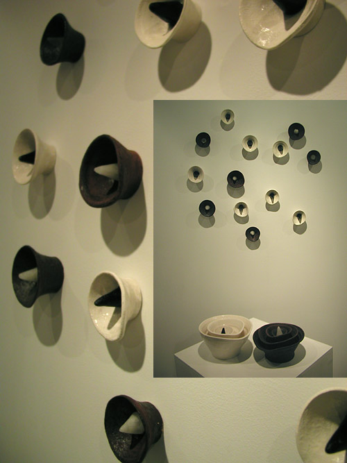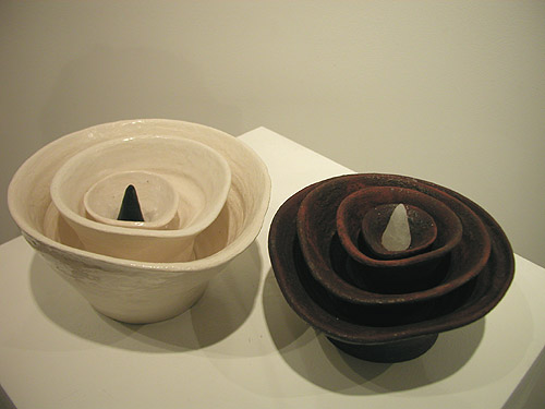 The free standing sculptures are stacked up bowls. no glue except for the cone inside the smallest bowl in each one.