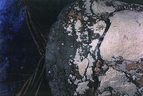 Detail showing how the clay and the engobe (I used slip with iron oxide) that I smeared inside the mold stuck to the glass