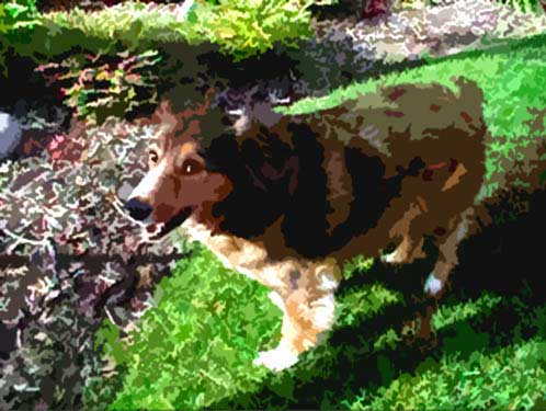 This image was created in several steps. First, my son took a QuickTime movie (.Mov) of our dogs with an Olympus digital camera. I used some conversion software to convert the file to .Avi format. I used "Painter" to find that just right frame and saved it as a .Jpeg. Next step was to import it into "PhotoShop" and tweak it. The contrast and saturation were increased to improve color and brightness. I used the Cutout filter with the following settings: No. Levels - 8, Edge Simplicity - 0, Edge Fidelity - 3. I needed to rebuild her eyes which were obscured by the filter. I like the way the background grass and plants look like puzzle pieces. This is a picture of my dog Jazz. She is a good puppy who smiles a lot and is sweet, she's just not very smart and a little overweight.