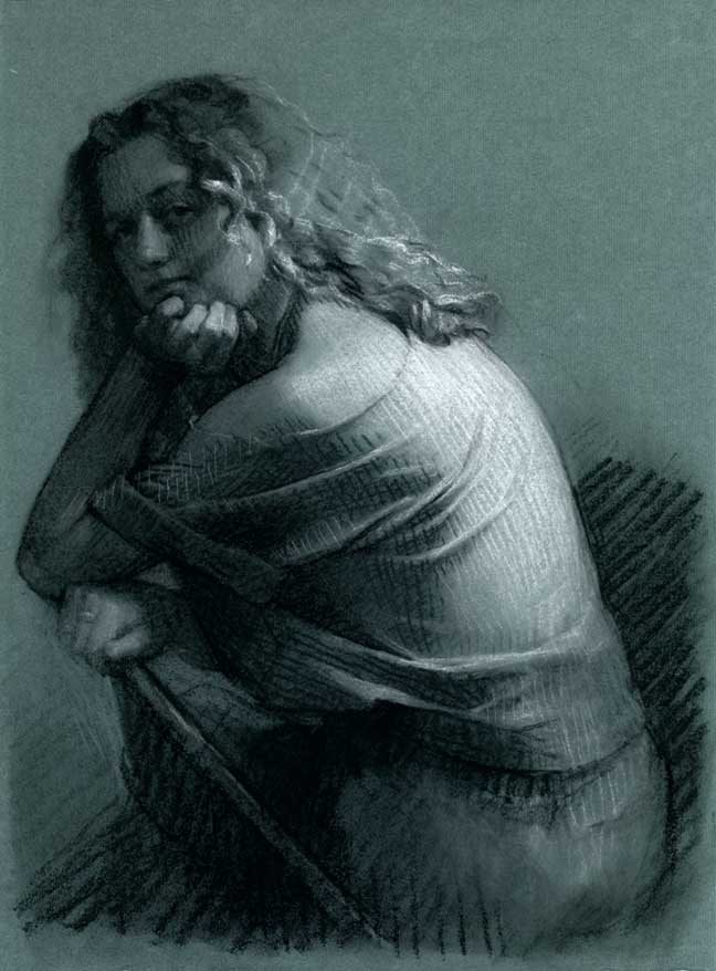 BLACK AND WHITE CHALK ON RUSCOMBE QUEEN ANN HANDMADE BLUE PAPER