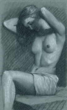 The lightly stumped white hatch running parallel to the length of the thigh became the final treatment. It remains unchanged to the end of the drawing.