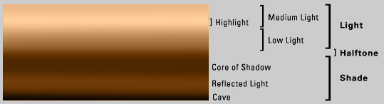 Halftone is found only where textured form turns from light, and is not
