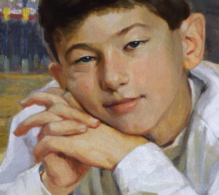 Indicating the shoulder of the girl on the left in The Simons Children,