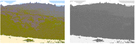 All the colors in the middle ground in the left-hand picture are the same value. I desaturated the bright, pretty colors (high chromas) out of the left-hand picture, and what's left is a plain flat gray field, shown on the right.