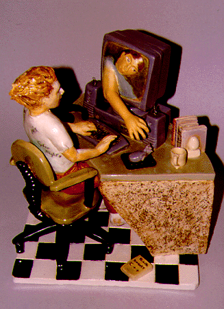 I use clay to produce symbols that express my feelings about the world around me. I like to say something about life with a combination of humor, love, and sensitivity. I hold a feeling when I do a piece, that will be strong enough to reach others (at the heart and soul level) that will give them the feeling of piece. Computers are a big part of life today. I visited my sons workplace and sketched his and other computer workstations. I used that material for this piece. There is a whole vocabulary for computer use. Words like cyberspace make the whole thing sound like science fiction. That is why I did this piece the way I did it. As I move through my life, I attempt to answer these questions, "How do we fit in the world?" and "How and why have we made ourselves so separate from our higher selves?" Life is fascinating. I am forever wondering at the meaning of our experience. My art is made up of images that capture my imagination. They are real to me, and I try to make them more intimate for others. |