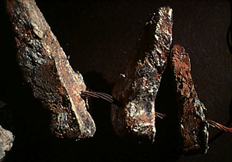 Sand on surface. Color comes from the copper scale. Dip in the middle of both pieces comes from a metal tube that was inserted into the sand mold and then taken away as soon the glass got stiff enough to hold the curve that the tube had created.