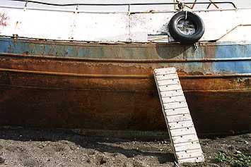 I used rusted steel and beach stones to raise the sculptures from the striped floor