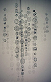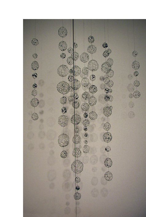 Stetzel is the third artist of the trio, and she combines ordinary materials to make site-specific sculptures. In one piece, she attaches air-filled bags made of plastic and string to the windows of the gallery; in another, she uses chicken wire to make a mobile of see-through balls.