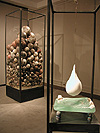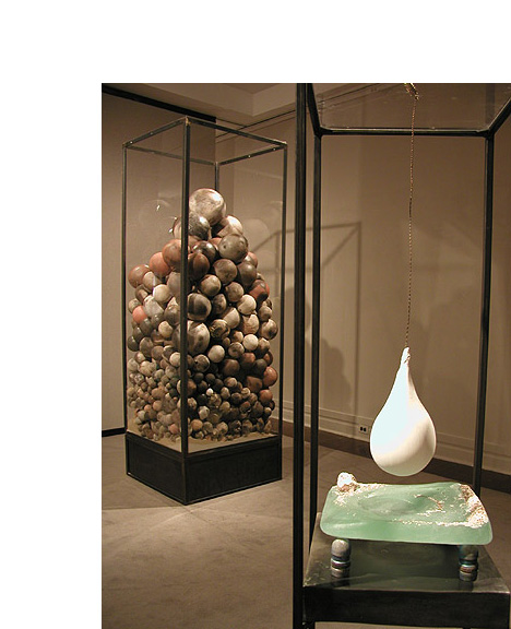 While she continues with her recycled materials, her pedestal pieces show other influences. These heavy balls with their spiked glass projections look like sea mines that might explode on contact.
