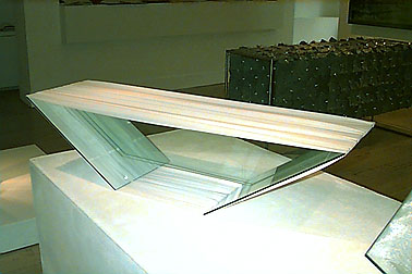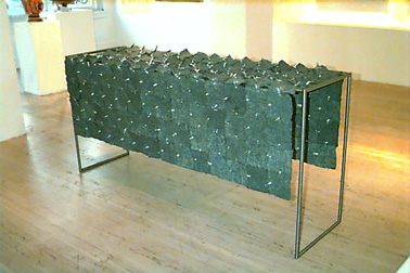 hot glass, fabric, shellac, fabricated steel - 38" h x 26" w x 72" long
