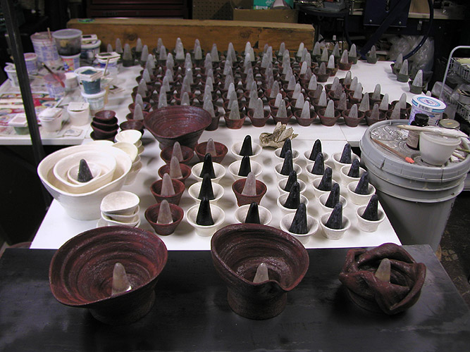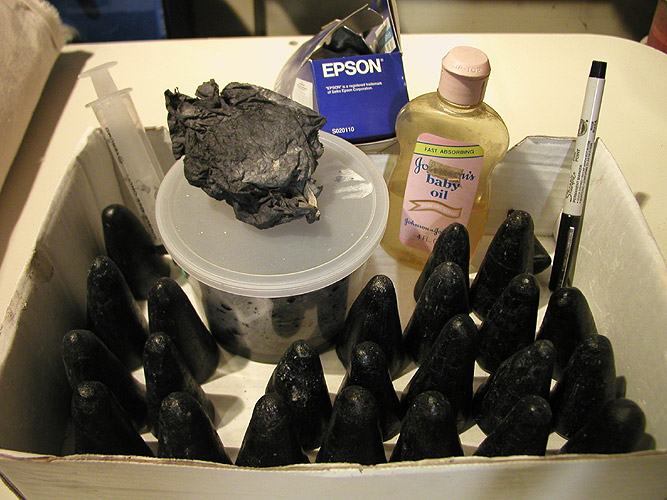 The kilnwash gets a little stuck in the dark cones so I color it with the leftover ink from the printer. For the really hard kilnwash that doesn't want to absorb the ink I use sharpie. I then make the whole thing shiny with baby oil.