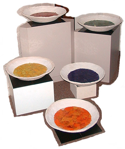 The work consists of five bowls with different colored glass,the four primary colors and then one that isn't. One interpretation is to look at the work as representing artists in society, slightly outside the standard mold. Being different can sometimes be appreciated, but at other times you long for a "regular" life. I am very fortunate to have a strong support group that keeps me going but there are artists that are not as fortunate. Independent of peoples view of someone's art, it adds color to society. |