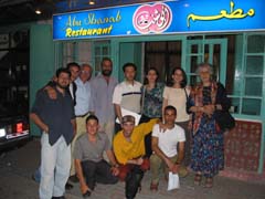 Thus it was that my teaching concerning creativity in art was being conducted among townspeople suffering the severe effects of a merciless siege. Palestinians are resisting this Israeli terrorism by trying to continue conducting life as fully as possible. The intention of my teaching was to encourage self-reliance in artistic decision making, to encourage intuitiveness, and to encourage innovation in the selection of art materials. The project was posted in advance on the web. The advance response to my posting was very moving and indicative of the devastation of the siege. The organizers in BeitLahem begged me to post illustrative pictures as they did not have sufficient library material for the students to understand the context of the project. Please read the Project for BeitLahem and associated Project Pictures I and Project Pictures II which I posted in response. Below is the amazing group of Palestinians going to dinner together to toast our collaboration. They treated me to the specialties of Abu Shanab restaurant. I am proud of their heroic Soumoud and both honored by and grateful for their beautiful hospitality.