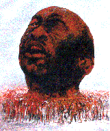 Most of the paintings are in grays with color reserved for blood and floral offerings.  In these paintings, the martyred dead lie heavily on the backs of the pathetic crowd.  Two notable sets of paintings enhance the show, One is of faces in pain and the other is of faces of Tyrants in decay.  Yahya creates an illusion of the mucky color and texture which articulate the giant heads of tyrants.  His skill is apparent in the totally visual differentiation between the loathsome faces of the tyrants and the painful expression in the heads of victims.