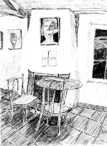 An Ice Cream Shop in Palo Alto. I like to go there for a sandwich (roasted red pepper & mozzarella or artichoke hearts & grilled gouda cheese) and a milk shake (ultra chocolate with a bit of raspberry sorbet mixed in). Sitting and drawing, accidentally knocked my shake off the table & splattered it onto the white plaster wall. Mop fixed it up.| Coastside | Stanford | BAY AREA | Michigan | About... |