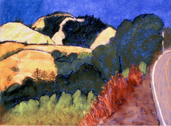 In this painting I'm working with pastel on blue paper. (actually, regular drawing paper that I had rubbed with ultramarine deep pastels and then spray-fixed to give a blue ground). I'm working with simplifying the forms of the landscape to find the essential elements that define the colored space.