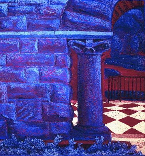This is painted on rough watercolor paper with a red-violet acrylic ground, which shows through the blue in the low spots of the paper, providing a contrasting (though not completely complementary) color to give the blues some oomph. Again I'm working to simplify forms, though in this case I have reversed the color scheme, rendering the yellow ochre sandstone in ultramarine blue.