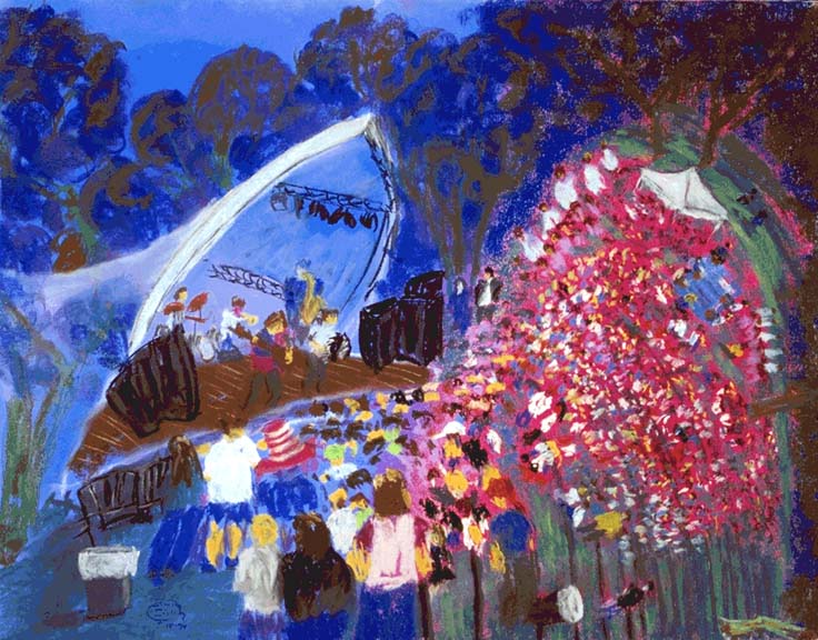 Playing at Frost amphitheatre at Stanford. Under the blue sky and a wonderfully hot "mass of incandescent gas." People dancing. People coming up to watch me drawing as the music makes my feet boogie.| Coastside | STANFORD | Bay Area | Michigan | About... |
