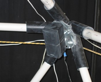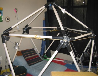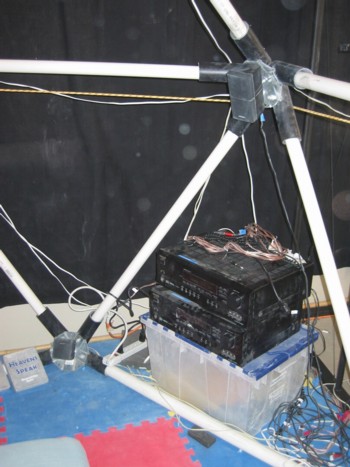Structure The (partial) icosahedron is made with PVC pipe, 25 pieces of equal length, with 11 corner joints made from a 5 sided metal plate, angled at the proper angle to form an icosahedron corner. These plates are available mail order from a chicken coop company in Minnesota. Five short pieces of ABS pipe are bolted to the plates, and the PVC pipes snick into the ABS to make the corners. The speakers are mounted on a bolt on a hole in the center of each plate, using wingnuts to allow for easy removal and replacement. The size of the pipes determines the size of the structure. 6 foot pipes result in an icosahedron that is about 10 feet wide and 8 feet tall; 4 foot pipes give one that is 7 feet wide and about 6 feet tall.