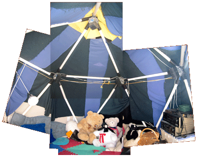 For the Burning Man installation, the icosahedron made of 6 foot pipes was enclosed in another icosahedron of the same design, made with 8 foot pipes. It was about 12 feet tall and 15 feet wide. That was covered with a form-fitted cover made of old sails discarded from a sail manufacturer. Then a small vestibule, like an igloo door, served as the front door and foyer. A cloth tunnel connected the vestibule with the inner structure. The electronics to run the computer and amps and the battery power system were placed in the space between the two structures and not usually visible. |