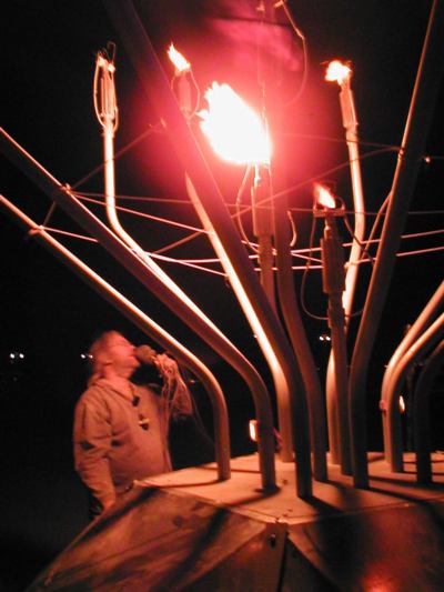 My contribution to the project was to write the audio software. I used Max/MSP running on a powerbook G4, with a MOTU 828 audio interface that would take input from the microphone, and produce 13 outputs, one for each flame. The core of the software is a sound snippet database system with a silence detector and random-interval recording system that would record soundbytes from 15 to 45 seconds long, and place them in a filesystem organized by time. A random playback system would select a file to play, and send it to its assigned flame. When a snippet finished, the system would delay a random amount, then play the next one. The random delays would increase if no one was speaking into the microphone, so that when someone spoke, there would be a burst of activity that would gradually fade to very sparse, only occasional sounds coming out. For each sound snippet, the burner would burst into flame (if it wasn't already going), wait a bit, then speak. |