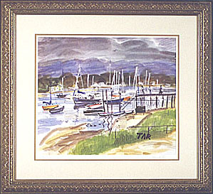 Another very popular piece, this work features a tranquil harbor setting. The cool green grass on the beach is wonderfully offset by the light brown sand, while the sky has a dubious purple haze with a lonely seagull en route. The boats rest in the harbor while a few persons enjoy the view from the pier. The setting is Long Island's Huntington Harbor and as with all of his works this piece was completed on location.