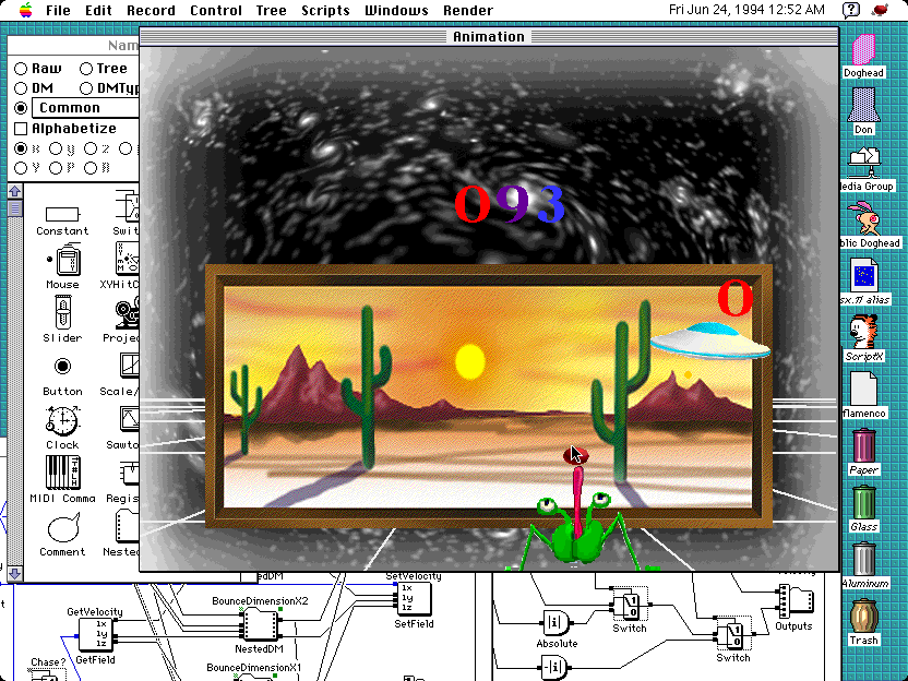 "Space Seed" is a neat demonstration of a graphical character behavior simulation written in Bounce. Most of the graphics were created by Big Twin, and the dataflow networks were created by Don Hopkins, David Levitt, and Big Twin.