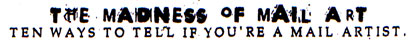 9. Your friends are all mad at you for sending them chain letters all the time. 8. You can't explain to non-mailartist people what it is, exactly, that you do with your spare time. 7. The art supply store is becoming suspicious about your frequent purchases of spray adhesive. 6. You have appeared in Ryosuke Cohen's Brain Cell project at least four times. 5. The postal clerks all try to take their breaks when they see you walk in. 4. You can disassemble and unjam a photocopier while blindfolded. 3. There are so many scraps of paper on your desk that you've added another desk in order to do "real" work. 2. There's stamp pad ink on your fingertips right now . . . . and the number 1 way to tell if you've got mailart madness: 1. You haven't recently communicated with family who live 10 miles away, but you send mail to six different people in Uzbekistan. |